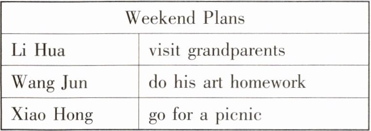 My friends Wang Jun, Xiao Hong and I have different weekend plans.I plan to visit my grandparents with my parents and my sister. We will make dumplings and have a big dinner together. I enjoy spending time with my big family. Wang Jun will do his art homework at home. He will paint an oil painting to show the beauty of his hometown. Xiao Hong plans to go out for a picnic with her friends. They will play games and enjoy the fresh air on the riverbanks.