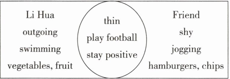 Hello, everyone. I'm Li Hua. I have a good friend, Li Lei. We always help each other. Both of us are thin. I'm outgoing while he is a little shy. We often play football together. Besides, I like swimming and he enjoys jogging. We both think staying positive is helpful. I eat vegetables and fruit every day because they are good for health. Li Lei likes hamburgers and chips but he seldom eat them because they are junk food. He knows they are not healthy at all.