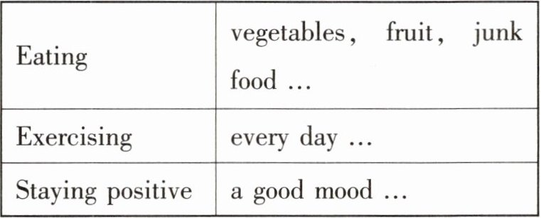 现在很多青少年不知道如何健康生活。假设你是李华,请根据下面表格的提示信息,以 “Live a Healthy Life” 为题,写一篇英语短文,谈谈如何保持健康。词数 80 个左右。
