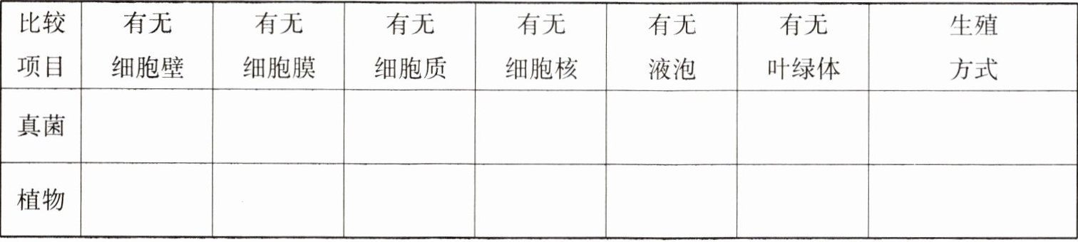 预习准备:1.霉菌主要包括曲霉、青霉、根霉等,是多细胞真菌,其营养体的基本结构是由细长的、分支的细胞组成的菌丝。酵母菌是单细胞真菌,细胞大,呈卵圆形。它们二者同属真菌,都有真正的细胞核。2.空气中的霉菌会落在面包上,面包富含碳水化合物、蛋白质等营养物质,面包里的水分和营养物质正好适合霉菌生长,面包是霉菌天然的培养基,再加上室温适宜的环境,所以面包放久了就会发霉。活动报告[方法步骤与记录]1.(1)水 (2)温暖 霉菌2.菌丝 甘油 无 无 有 球 圆 黑(注:以上观察结果可能因霉菌种类而异,请根据实际观察结果填写)[讨论]1.青霉等多细胞真菌是通过菌丝从外界吸收有机物的。2.霉菌的部分菌丝,能产生大量的孢子,孢子随风飘散,遇到适宜的环境条件即发育成新菌体。![img alt=图片无编号]总结思考真菌 有 有 有 有 有 无 孢子生殖或出芽生殖植物 有 有 有 有 有 有 有性生殖或营养生殖