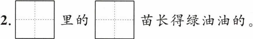 2. $\overset{tián}{\begin{matrix}\\□\end{matrix}{\begin{matrix}\\□ }里的\overset{hé}{\begin{matrix}\\□\end{matrix}{\begin{matrix}\\□ }$苗长得绿油油的。
