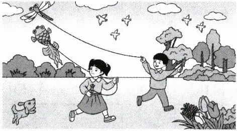 示例:春天来了,蓝蓝的天上飘着几朵白云,几只小鸟在自由飞翔。草地像一块绿毯,上面开着几朵小花。小狗在草地上奔跑。哥哥和妹妹在草地上放风筝,他们玩得真开心啊!