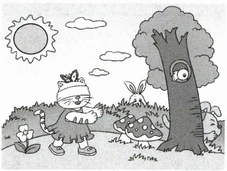 示例:今天,风和日丽。小猫、小狗、小兔和小鸟在森林里捉迷藏。小兔藏在草丛里,小狗藏在大树后,小鸟藏在鸟窝里。小猫蒙上眼睛一个个地找,它们玩得真开心!