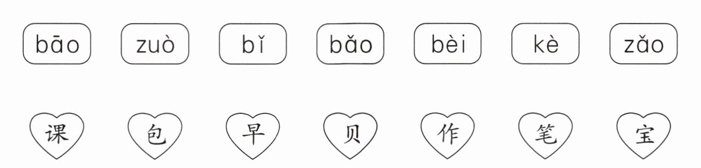 bāo——包;zuò——作;bǐ——笔;bǎo——宝;bèi——贝;kè——课;zǎo——早。