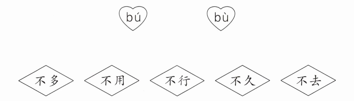 $\begin{array}{|c|}\hline 不多 \\ \hline \end{array}\\ \hline $ $\begin{array}{|c|}\hline 不用 \\ \hline \end{array}\\ \hline $ $\begin{array}{|c|}\hline 不行 \\ \hline \end{array}\\ \hline $ $\begin{array}{|c|}\hline 不久 \\ \hline \end{array}\\ \hline $ $\begin{array}{|c|}\hline 不去 \\ \hline \end{array}\\ \hline $