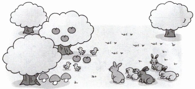 6. 看图填一填,并学着讲一讲画面里的数学故事。