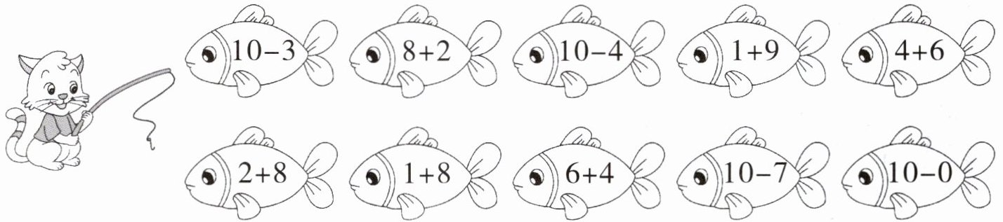 5. 小猫钓到了身上算式的得数是10的鱼,请把它们圈起来。小猫钓到了(