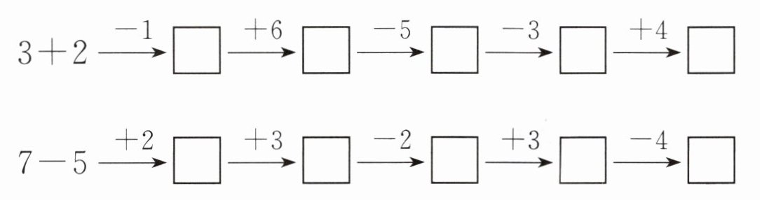 $\begin{array}{cccccc}3+2 \xrightarrow{-1} □ \xrightarrow{+6} □ \xrightarrow{-5} □ \xrightarrow{-3} □ \xrightarrow{+4} □ \\7-5 \xrightarrow{+2} □ \xrightarrow{+3} □ \xrightarrow{-2} □ \xrightarrow{+3} □ \xrightarrow{-4} □\end{array}$