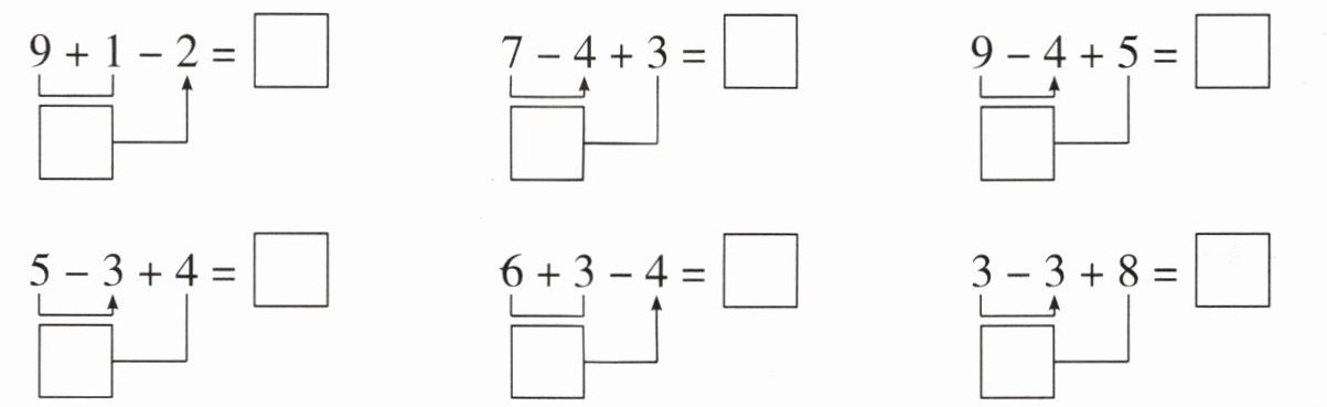 $\begin{array}{ccc}9+1-2=□ & 7-4+3=□ & 9-4+5=□ \\□ & □ & □ \\5-3+4=□ & 6+3-4=□ & 3-3+8=□ \\□ & □ & □\end{array}$