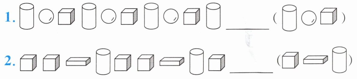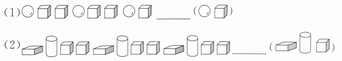 1. 观察第一组图形,发现“圆柱、球、正方体”为一组循环出现。已有的图形序列是“圆柱、球、正方体、圆柱、球、正方体、圆柱、球、正方体、圆柱”,所以“圆柱”后面应是“球”。