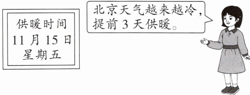 3. 11月15日是计划供暖时间。提前供暖后,供暖的第一天是11月几日,星期几?
