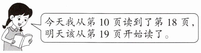 方法二:用列式计算的方法,18-10=8(页),求的是第18页比第10页多的页数,还要加上开始读的第10页,即8+1=9(页),列综合算式为18-10+1=9(页)。
