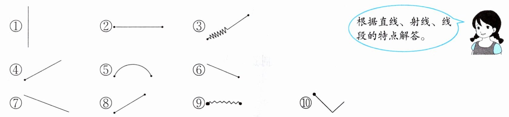 1. 下面的图形,哪些是直线?哪些是射线?哪些是线段?将序号写在横线上。