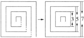 分析:如下图所示,将虚线部分移动到实线部分,于是得到了三个边长分别为3厘米、5厘米、7厘米的正方形和中间一个“凵”。所以螺线的总长度为(3+5+7)×4+1×3=63(厘米)。