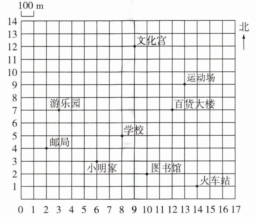 (1)游乐园(3,7) 小明家(6,3) 学校(8,5) 文化宫(9,12) 图书馆(10,2) 百货大楼(12,7) 运动场(13,9) 火车站(14,1)