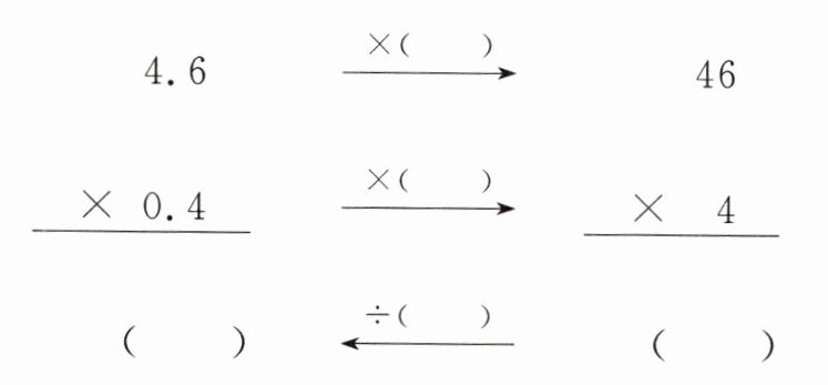 $ \begin{array}{ccc} 4.6 & \xrightarrow{×(\quad)} & 46 \\ × 0.4 & \xrightarrow{×(\quad)} & × 4 \\ (\quad) & \xleftarrow{÷(\quad)} & (\quad) \end{array} $