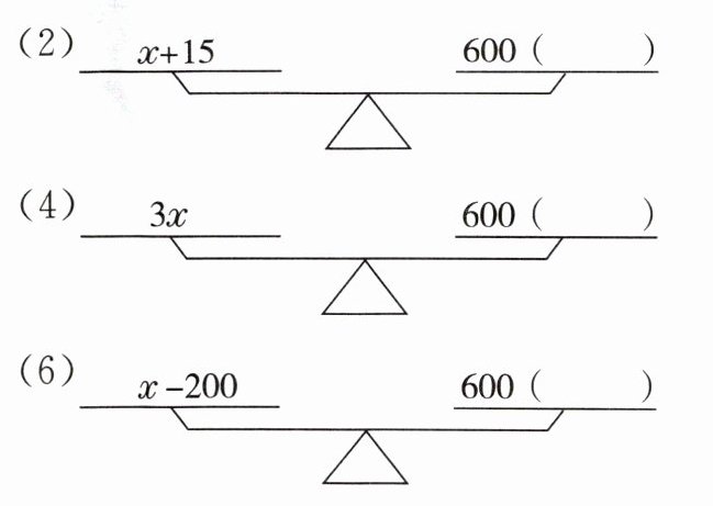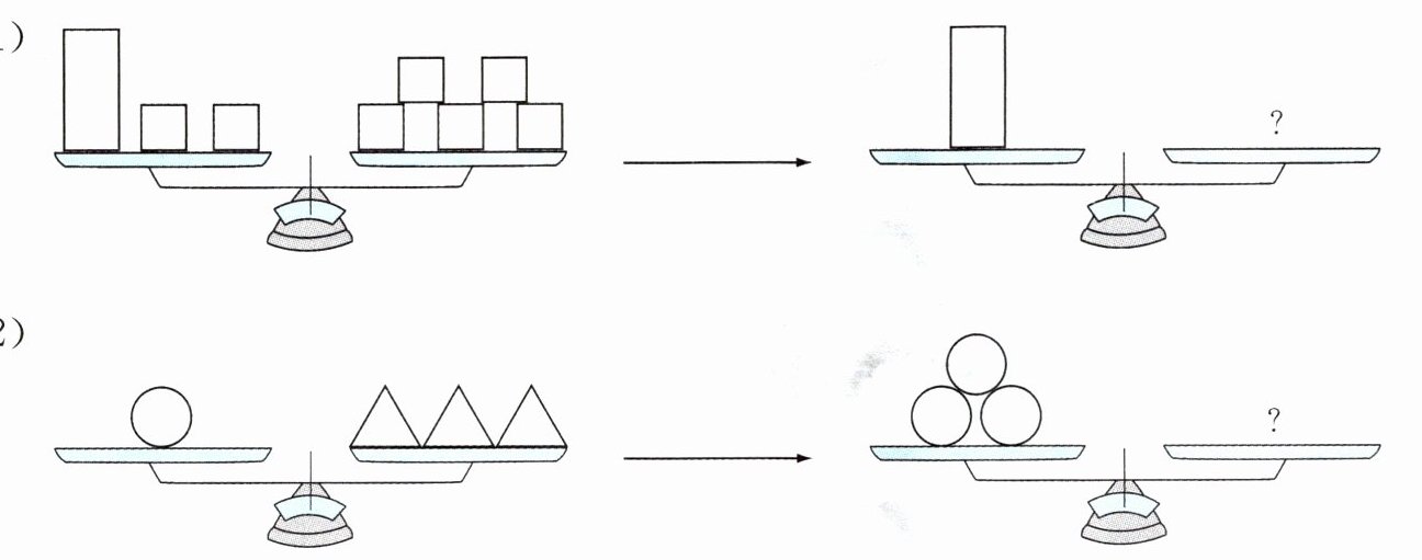 3. 根据图(1),在下面每幅图的括号里填上适当的符号和数,使天平平衡。