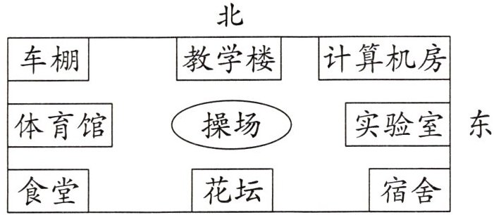 2. 食堂在花坛的( )面,计算机房在教学楼的( )面,车棚在体育馆的( )面,宿舍在实验室的( )面。
