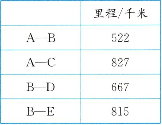 1. 画一画略 815-667=148(千米) 2. 表示的是B和C之间的里程。画一画略 827-522=305(千米) 3. A和E之间的里程。