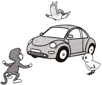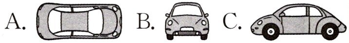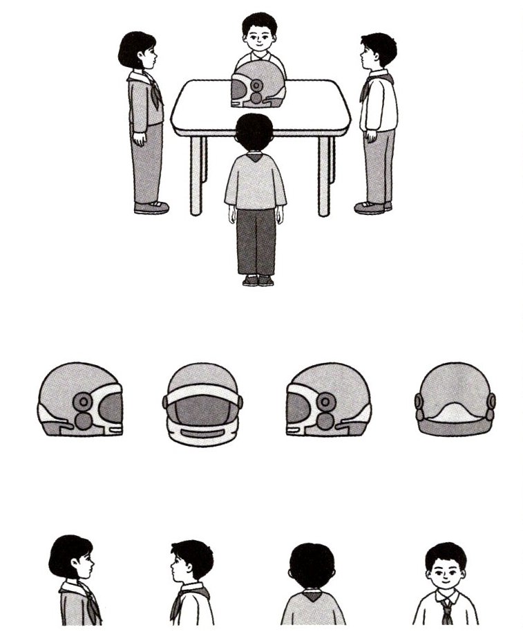 左侧的女孩看第一个头盔图;背对我们的男孩看第二个头盔图;右侧的男孩看第三个头盔图;正对头盔的男孩看第四个头盔图。