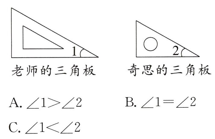 2. 如图,两个三角板中的$\angle 1和\angle 2$的大小关系是( )。