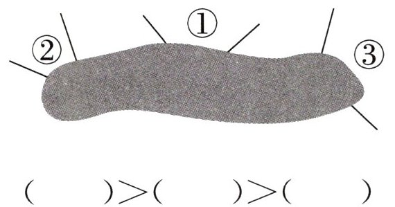 五、老师在黑板上画了三个角(分别用①②③表示),值日的同学不小心擦掉了一部分。请你把这三个角按从大到小的顺序排列。(填序号)