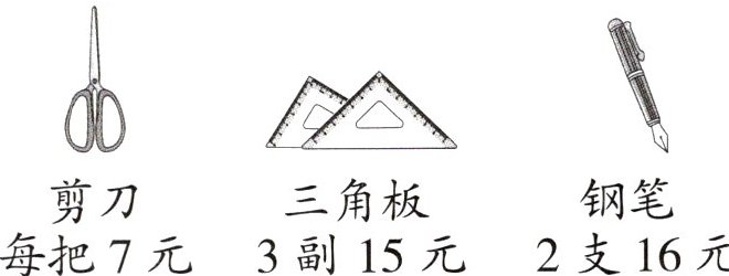 2. 小红买了 1 副三角板和 2 支钢笔,一共花了多少元?