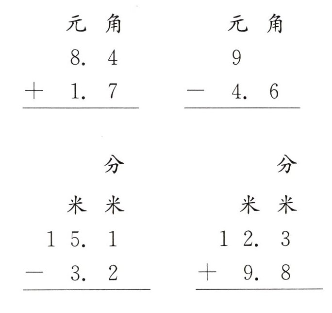 \begin{array}{r}元 角\\8.4\\+\quad1.7\\\hline\end{array}\\\hline $
