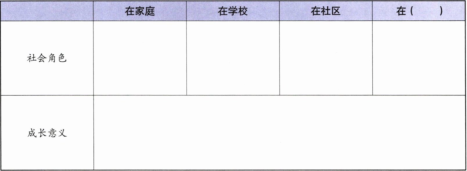 深入思考【示例】社会角色:在家庭,我是子女;在学校,我是学生;在社区,我是居民;在商场,我是消费者……成长意义:在社会生活中,我们学习生活技能,学习行为规范,促进自我发展,创造更加美好的未来等。