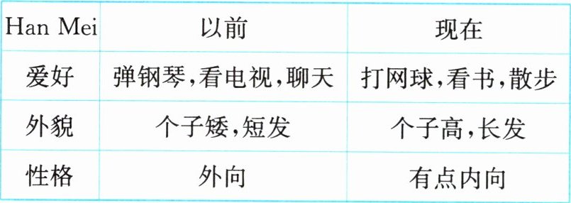 Han Mei is now different from what she used to be. She used to like to play the piano, but now she enjoys playing tennis. She used to watch TV or chat with others after supper, but now she usually reads books or has a walk. She is much taller than before. She used to have short hair, but now her hair is very long. She is a little quiet now, and not outgoing any longer. A person sure changes!