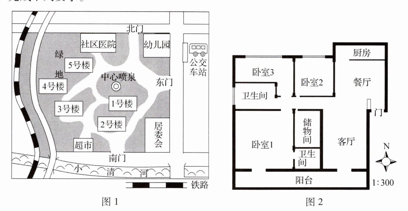 12. 小鹤同学随父母前往某小区看房。图1为该小区平面示意图,图2为1号楼某户型示意图。读图,完成下列要求。