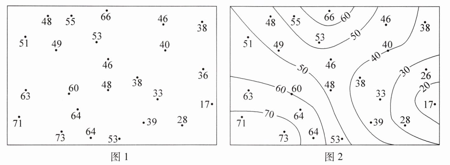 9. 图1标注了某区域测绘点的海拔(单位:米),图2为根据图1绘制的等高线图(单位:米)。读图,完成下列要求。