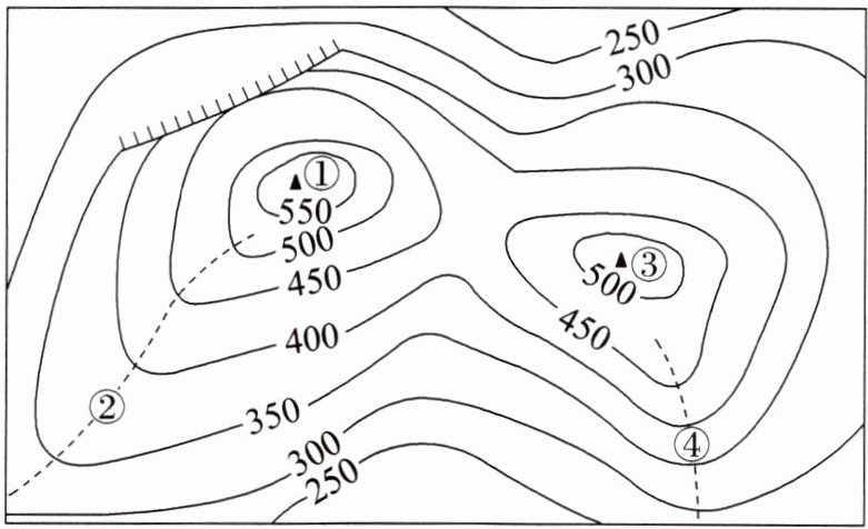 (1)海拔由中部向四周逐渐降低;黑色三角符号为山峰的常用图例。 (2)相同点:②④两处等高线的弯曲部分都向低处凸出,都为山脊。 不同点:②处等高线稀疏,坡度较缓;④处等高线密集,坡度较陡。