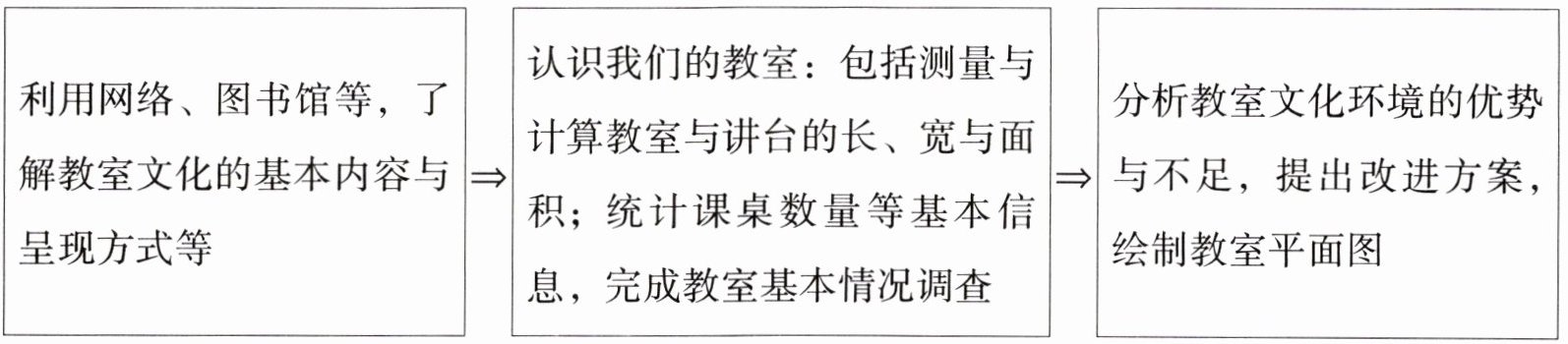 A[利用网络、图书馆等,了解教室文化的基本内容与呈现方式等] --> B[认识我们的教室:包括测量与计算教室与讲台的长、宽与面积;统计课桌数量等基本信息,完成教室基本情况调查]