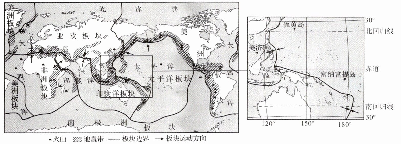 15. 海洋和陆地处于不断的运动和变化之中。同学们查找到一些岛屿“海陆变迁”的实例,进行探究活动。下图为世界六大板块及主要火山、地震带分布图。阅读图文材料,完成下列要求。