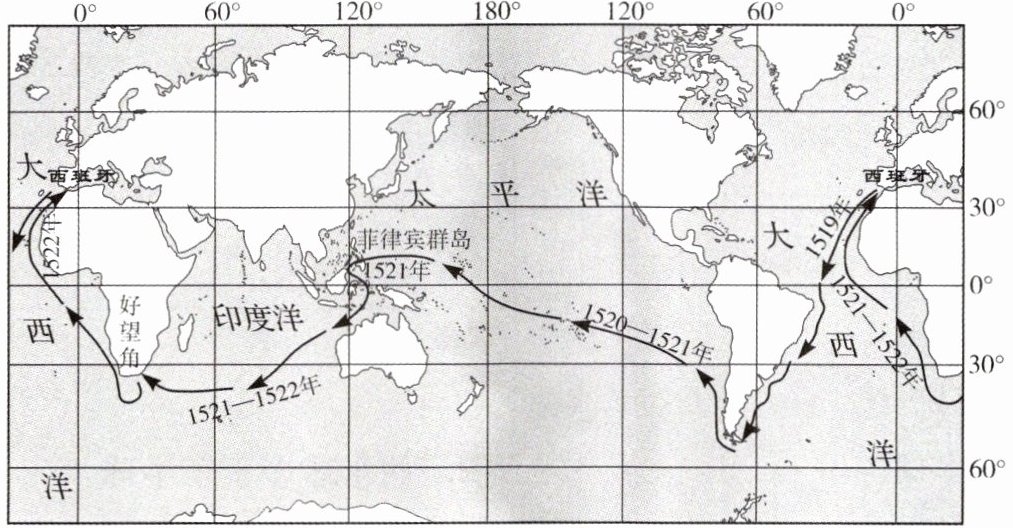 500 多年前,麦哲伦率领的船队完成了人类首次环球航行,证明了地球的形状为球体。下图为此次航行路线示意图。读图,完成 1~3 题。