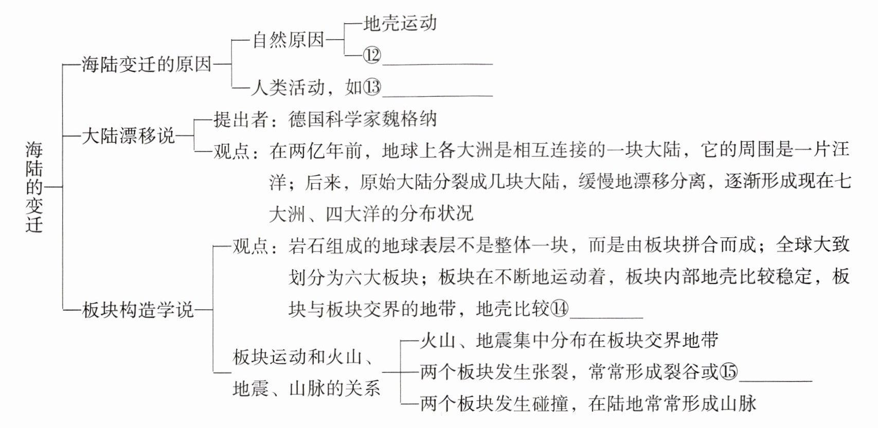 观点:岩石组成的地球表层不是整体一块,而是由板块拼合而成;全球大致划分为六大板块;板块在不断地运动着,板块内部地壳比较稳定,板块与板块交界的地带,地壳比较⑭