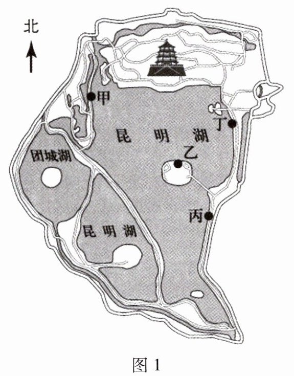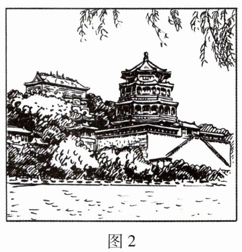 11. 2024年6月3日,多云,小明到颐和园写生。图1为颐和园导览图,图2为他的绘画作品。读图,完成下列要求。