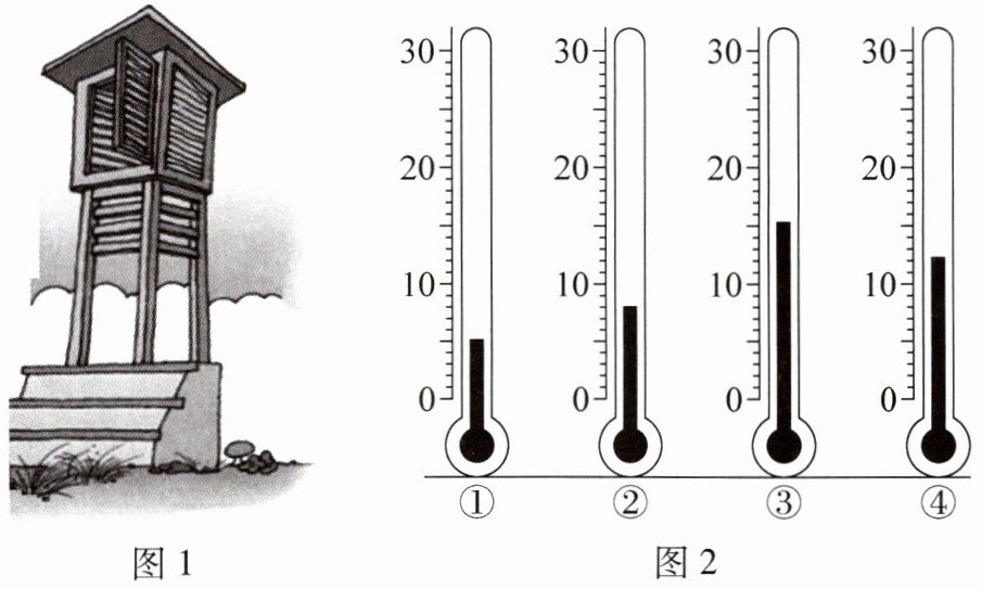为了提高同学们的地理观测能力和动手实践能力,某中学地理兴趣小组利用校园气象站,开展了气温观测地理实践活动,并对气温的变化进行探究。图1为百叶箱示意图,图2为当日四次气温观测数据示意图(单位:℃)。据此完成1~4题。