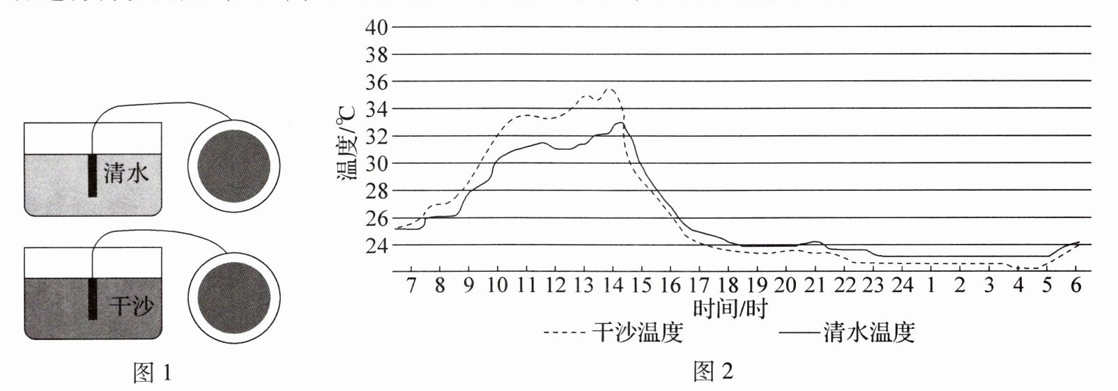 。(2)在晴朗的天气条件下,将盛有清水和干沙的玻璃容器同时放置在室外,插入温度传感器进行自动测温(图1),并把温度上传到记录仪上,记录的数据见图2。