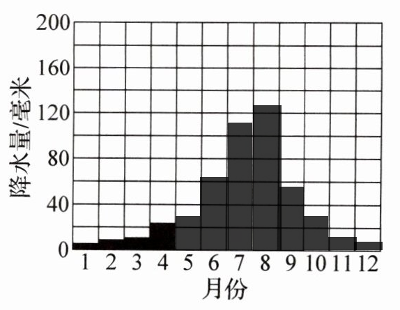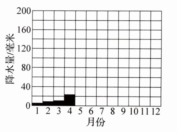 4. 下表为北半球某地多年平均各月降水量数据表。根据表中数据,完善该地降水量柱状图,并归纳该地降水量的季节变化特点。