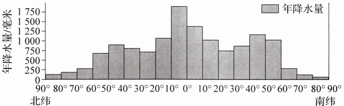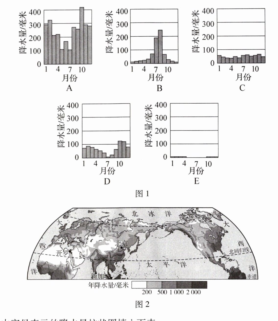 某学校七年级学生对世界年降水量的分布进行了探究学习。图1为北半球五个城市降水量柱状图,图2为北半球年降水量分布图。