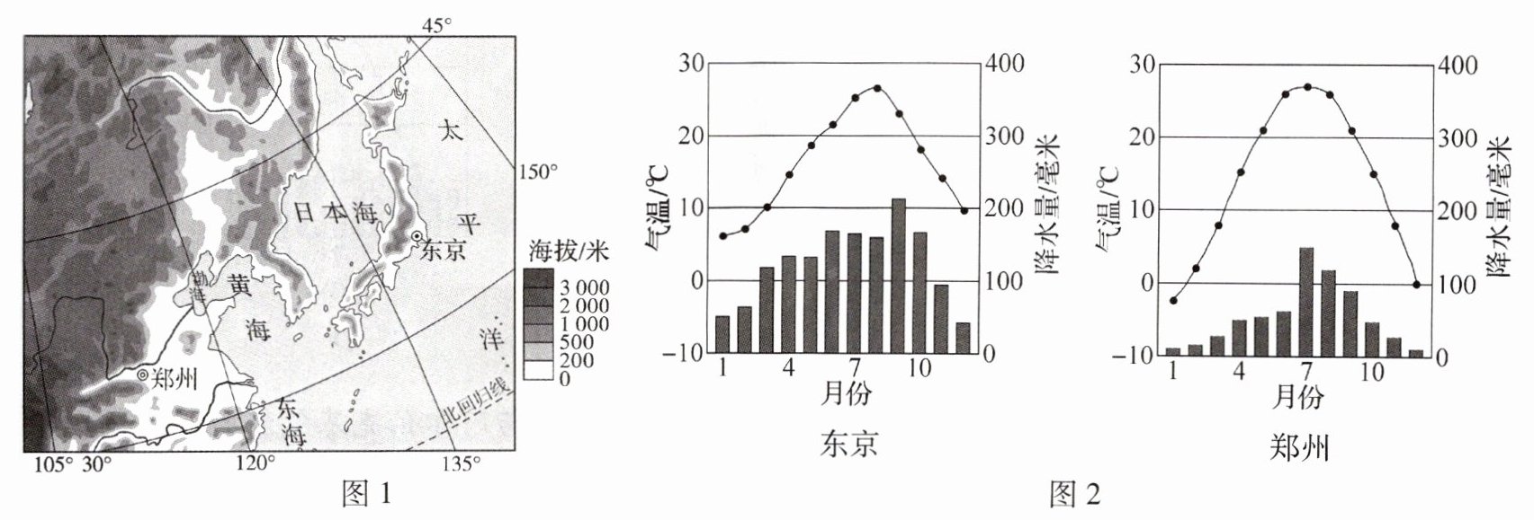 图 1 示意东京和郑州的位置,图 2 为两地气温曲线和降水量柱状图。读图,完成 1~2 题。