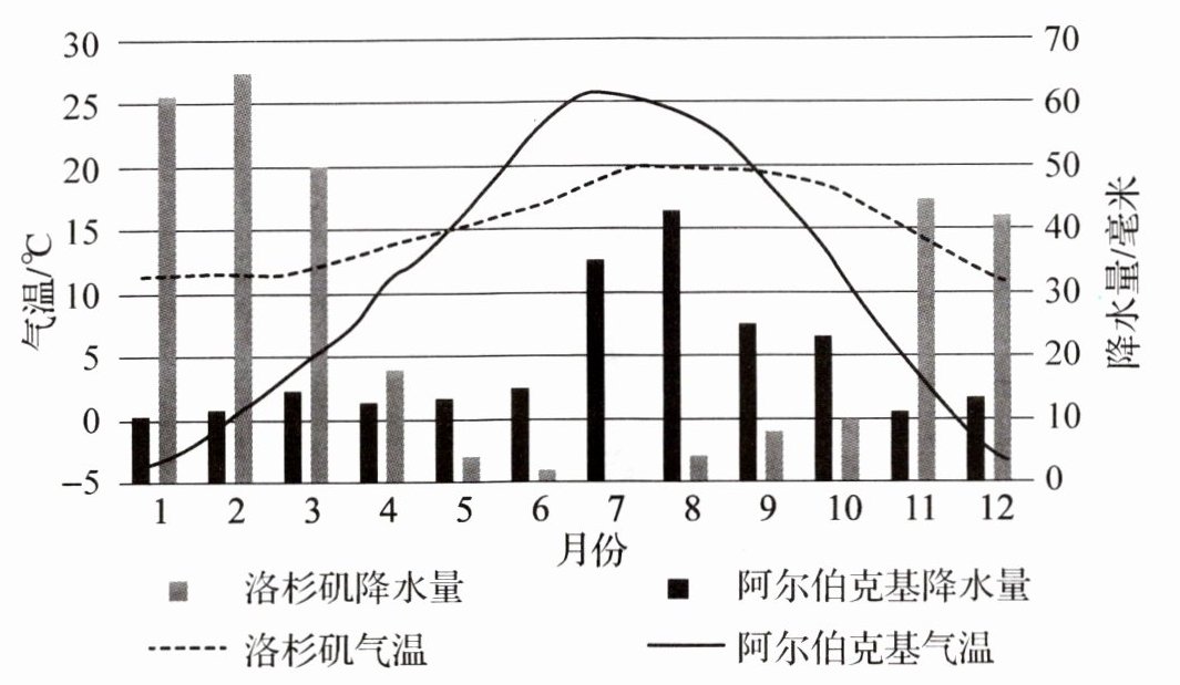 美国城市洛杉矶与阿尔伯克基均位于 $35^{\circ}N$ 附近。读洛杉矶与阿尔伯克基气温曲线和降水量柱状图,完成 5~6 题。