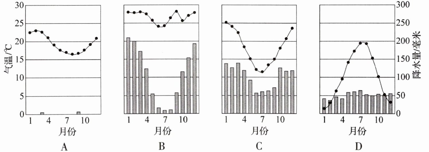 4. 纺锤树生长的地区的气温曲线和降水量柱状图最可能是(