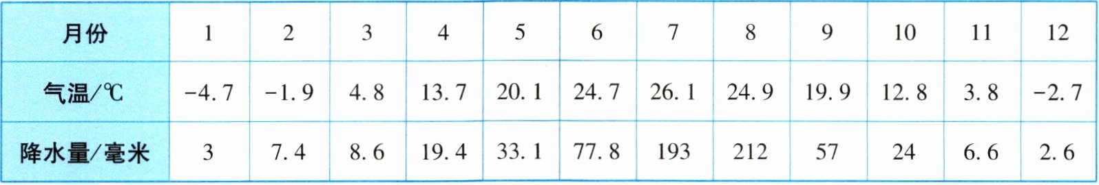 7. 下表为北京市多年平均各月气温和降水量数据表。读表,完成下列要求。