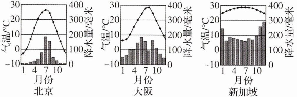下图为北京、大阪和新加坡三地气温曲线和降水量柱状图。读图,完成 8~9 题。