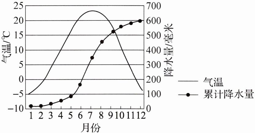 下图示意某地月平均气温和降水量逐月累计情况。读图,完成 10~11 题。