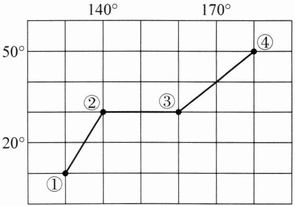 (1)标注略 (2)出发地(10°N,130°E);到达地(50°N,180°)。 (3)③ (30°N,160°E)。(4)先向东北,再向正东,后向东北。 (5)B
