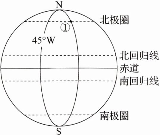 10. 在地球仪上,经线和纬线相互交织,形成经纬网。我们可以利用经纬网确定地球表面任何一个地点的位置。下图中①地的经纬度是(